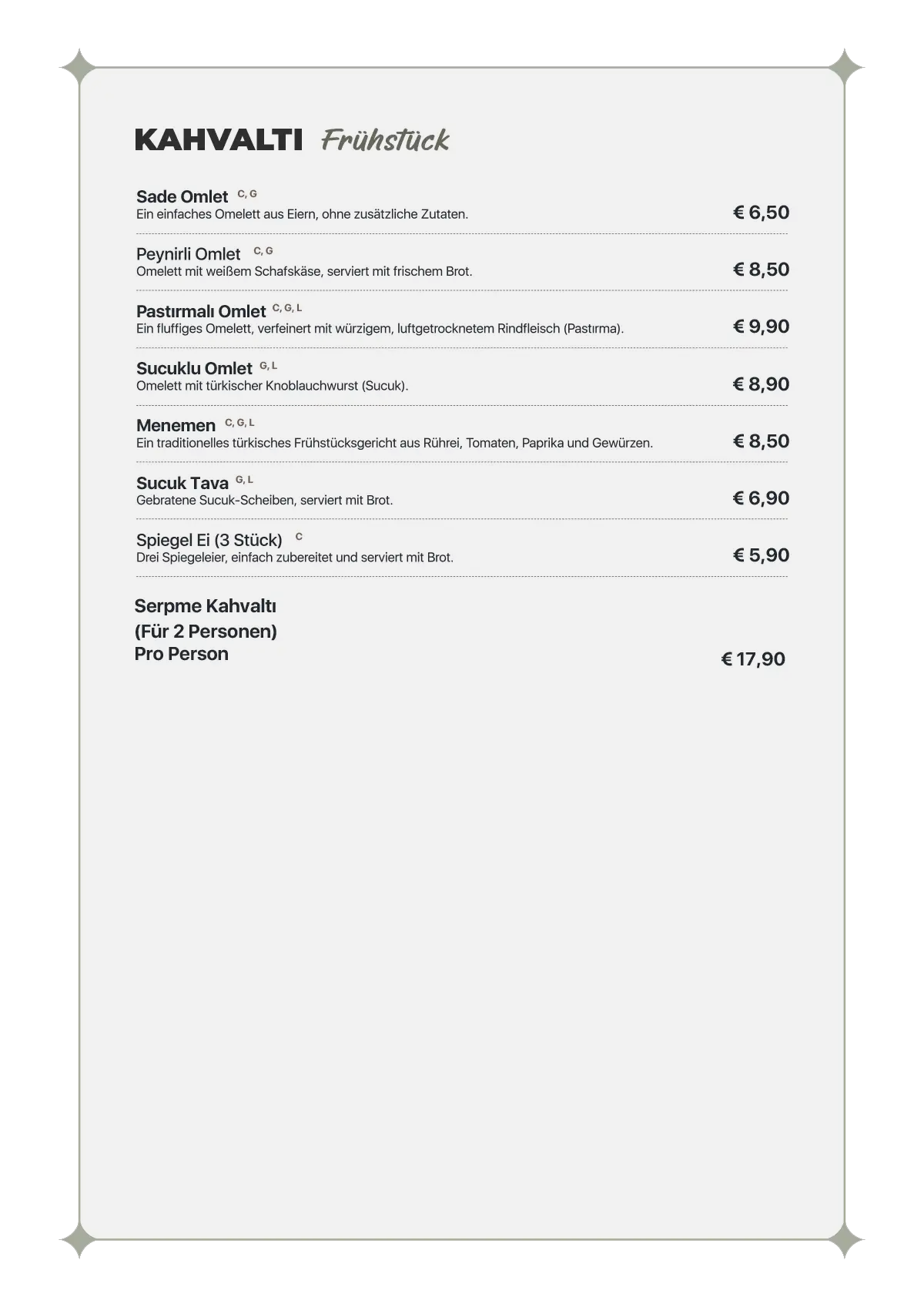 Ein türkisches Frühstück ist mehr als nur ein kleiner Snack – es ist ein Fest für alle Sinne. Im Antep Evi Grill Haus legen wir größten Wert auf Qualität, Frische und Authentizität. Deshalb bereiten wir alle Speisen hausgemacht und nach traditionellen Rezepten zu. Neben klassischen Frühstücksvariationen erwarten Sie köstliche Eierspeisen, würzige Pasten, regionale Spezialitäten und frisch gebackene Fladenbrote. Die reiche Auswahl spiegelt die Vielfalt der türkischen Küche wider und macht jedes Frühstück zu einem besonderen Erlebnis.