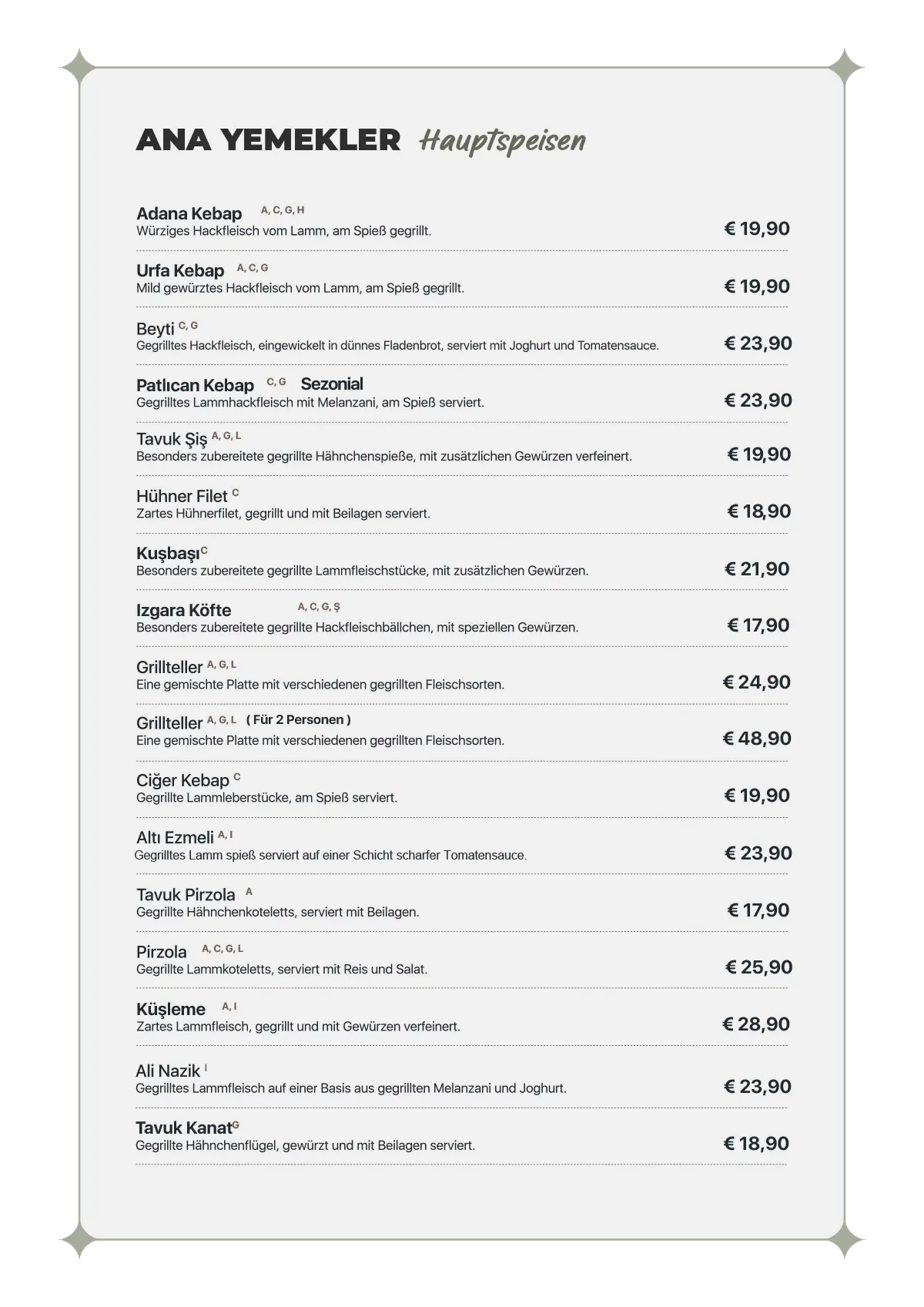 Die Grillspezialitäten sind das Herzstück unserer Hauptspeisen. Spieße aus Lamm, Huhn oder Kalb werden über Holzkohle gegrillt und entfalten dadurch ihr unverwechselbares Aroma. Diese traditionelle Zubereitung ist tief in der Gaziantep-Küche verwurzelt, die in der Türkei für ihre Geschmacksvielfalt bekannt ist. Im Antep Evi Grill Haus achten wir darauf, dass jede Portion frisch und halal serviert wird. Ob als einzelner Grillspieß oder üppiger Grillteller mit Gemüse – bei uns schmecken Sie die Essenz türkischer Kochkunst.