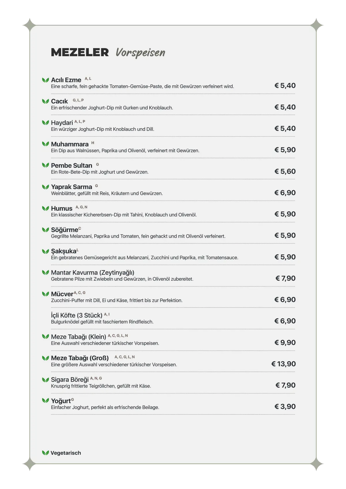 Türkisches Essen lebt von seiner Vielfalt – und das zeigt sich besonders in unseren Vorspeisen. Probieren Sie cremigen Hummus, würziges Ezme, aromatischen Auberginensalat oder Joghurt mit Gurken und Knoblauch. Auch gefüllte Weinblätter und frische Salate gehören zu unserem Angebot. Diese Auswahl macht jede Mahlzeit abwechslungsreich und eröffnet Ihnen die ganze Geschmackswelt des Orients. Lassen Sie sich von unserer Vorspeisenplatte inspirieren und genießen Sie die Vielfalt der türkischen Küche in Wien.