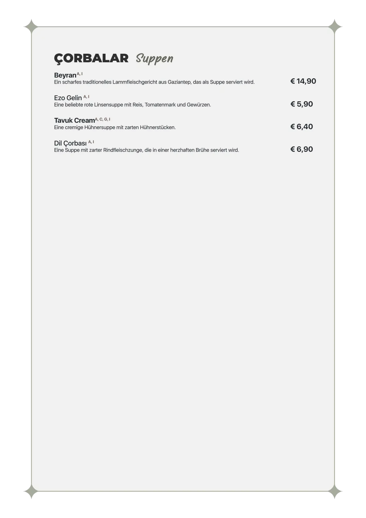 Unsere Suppen sind ein wahres Highlight: Ob Linsensuppe, Joghurtsuppe oder kräftige Fleischvarianten – jedes Rezept basiert auf authentischer türkischer Tradition. Im Antep Evi Grill Haus legen wir größten Wert auf Frische und Qualität. So schmecken Sie den Unterschied: sorgfältig ausgewählte Zutaten, schonend gekocht und mit orientalischen Gewürzen fein abgeschmeckt. Dazu servieren wir knuspriges Brot aus dem Gasofen, das frisch gebacken den vollen Genuss abrundet.